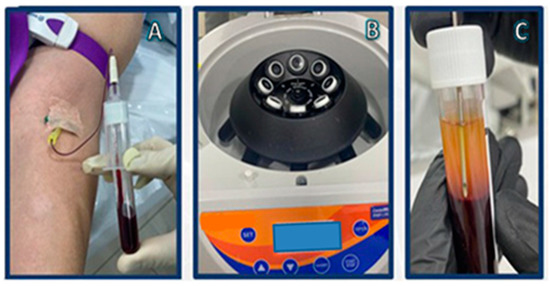 i-PRF preparation: (A) vacuum-extraction blood specimen collection; (B) centrifugation; (C) i-PRF aspiration.
