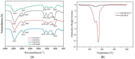(a) FTIR spectra of LR-EPI-5, LR-EPI-6, LR-EPI-8, and LR-NaOH and (b) DTA of LR-EPI before and after adsorption (Cr3+).