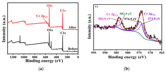 XPS spectra of (a) all elements of LR-EPI-8 before and after Cr3+ adsorption, (b) Cr 2p1/2 and Cr 2p3/2 for LR-EPI-8 after Cr3+ adsorption, (c) C 1s, and (d) O 1s for LR-EPI-8 before and after the adsorption.