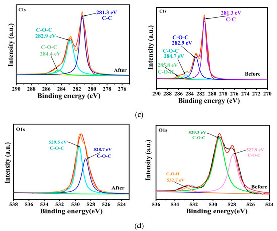 X-ray photoelectron spectroscopy (XPS) analysis was utilized to gain insights into the interactive behaviors between the adsorbents and adsorbates. The survey spectrum (Figure 2a) revealed notable changes when comparing pristine LR-EPI-8 with LR-EPI-8-Cr. Specifically, a new peak attributed to Cr at 574.5 eV was observed in LR-EPI-8-Cr, indicating the successful adsorption of Cr3+ onto the surface of LR-EPI-8. In Figure 2b, the Cr 2p1/2 and Cr 2p3/2 XPS spectrum exhibited two distinct peaks at binding energies of 582.9, 583.9, 574.5, and 573.8 eV, which were assigned to Cr 2p1/2 and Cr 2p3/2, respectively. The C 1s XPS peaks of LR-EPI-8 could be deconvoluted into four peaks (i.e., 281.3 eV (C-C), 282.9 eV (C-O-C), 284.7 eV (C-O-C), and 285.8 eV (C-O-H)) (Figure 2c). It was evident that the characteristic peak of C-O-H disappeared after Cr3+ adsorption, while the 282.9 eV (C-O-C) peak remained unchanged, indicating the preservation of the cellulose structure. Additionally, the 532.7 eV (C-O-H) peak vanished, suggesting that the primary adsorption group for Cr3+ was the -OH group (Figure 2d).