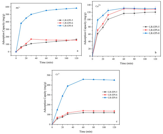 Contact time is another significant factor that influences the adsorption equilibrium. The adsorption of Pb2+, Cu2+, and Cr3+ was conducted for a duration of 120 min. The adsorption capacities of the LR-EPI hydrogels increased steadily with the duration of adsorption until reaching equilibrium, as shown in Figure 5. As the binding sites became nearly saturated pollutants, the active sites of the hydrogels reached an increasing saturation, resulting in the adsorption capacities reaching equilibrium. With a longer contact time, more heavy metal ions were bound to the surface of the hydrogels, thereby increasing the adsorption capacities. Additionally, during the adsorption process, swelling and adsorption might occur simultaneously. As the swelling ratio increased, the heavy metal ions gradually entered gel pores with water [40]. The equilibrium adsorption time for Pb2+, Cu2+, and Cr3+ on LR-EPI-5 and LR-EPI-6 was approximately 60 min due to their lower -OH content compared to LR-EPI-8. In comparison to LR-EPI-5 and LR-EPI-6, LR-EPI-8 exhibited a faster adsorption rate (120 min for Pb2+ and 60 min for Cu2+ and Cr3+) and much higher maximum adsorption capacities (583.6 mg/g and 458.3 mg/g) for Pb2+ and Cr3+. The possible reason for this is that the active groups of LR-EPI-8 increased with the LR concentration, and Pb2+ and Cr3+ were more selectively adsorbed by the hydrogels.