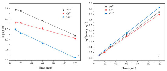 (a) Pseudo-first-order and (b) pseudo-second-order kinetic model for adsorption of heavy metals.