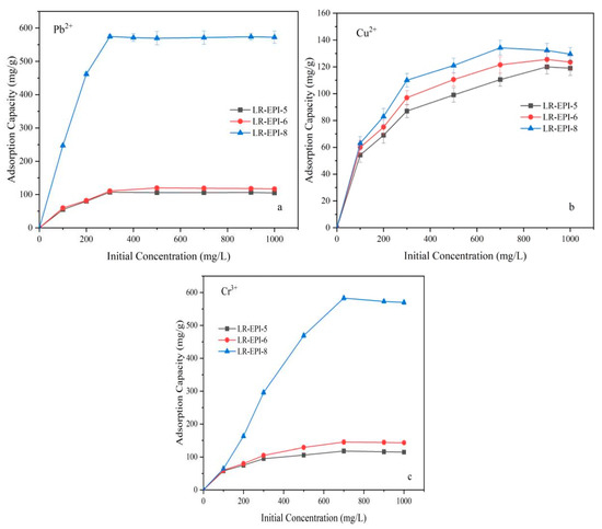 The impact of the initial concentration of Pb2+, Cu2+, and Cr3+ on the adsorption was analyzed, with concentrations ranging from 100 to 1000 mg/L (Figure 7). It was observed that when the initial concentrations of Pb2+, Cu2+, and Cr3+ were 300 mg/L, 700 mg/L, and 700 mg/L, respectively, the adsorption processes reached equilibrium, indicating that the active sites were almost fully occupied. The highest adsorption capacities were achieved by LR-EPI-8 and LR-EPI-6, with values of 574.5 mg/g and 120.6 mg/g for Pb2+, 134.3 mg/g and 125.5 mg/g for Cu2+, and 583.5 mg/g and 145.8 mg/g for Cr3+, respectively. LR-EPI-5 exhibited a maximum adsorption capacity of 120.2 mg/g for Cu2+. Notably, LR-EPI-8 exhibited significantly higher adsorption capacities for Pb2+, Cr3+, and Cu2+ compared to LR-EPI-5 and LR-EPI-6, indicating a greater number of active sites available for metal ion removal and thereby resulting in its superior capacity. This phenomenon can be attributed to the presence of more positively charged ions which create a stronger driving force for the effective collision between ions and surficial functional groups of the hydrogel. Consequently, this promotes ions transfer between the two phases and collision between the metal ions and surficial functional groups of the hydrogels [40]. Once the active sites were fully occupied, the adsorption performance of the three hydrogels for heavy metals diminished [57], reaching equilibrium.