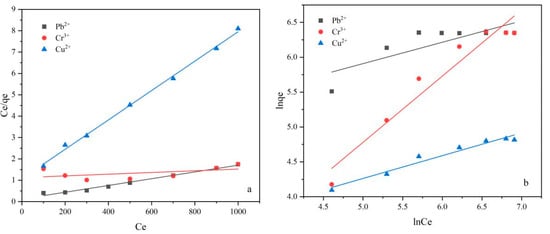 where qe (mg/g) is the adsorption amount at equilibrium, Ce (mg/L) is the concentration at equilibrium, KL is the Langmuir constant, qm (mg/g) is the maximum adsorption amount covering the entire surface, RL is a separation coefficient or an equilibrium parameter, C0 (mg/L) is the initial concentration of heavy metal ions, and KF and n are Freundlich constants.