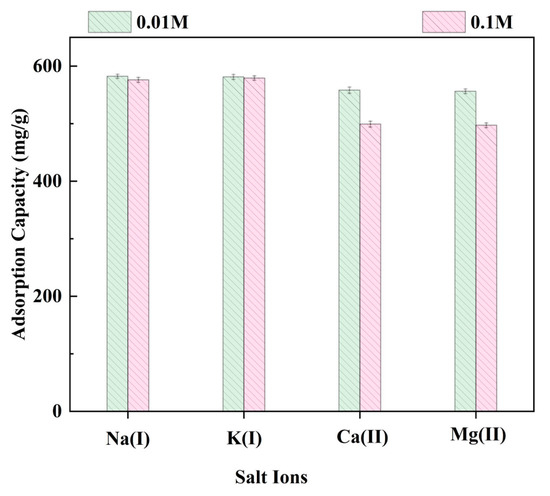The interference capability of LR-EPI-8 against competing ions was investigated in the presence of various complex water matrices for the purpose of Pb2+ removal. To evaluate the competition between Pb2+ and other cations, such as Na+, K+, Ca2+, and Mg2+, salt ions were used at concentrations of 0.01 and 0.1 mol/L. As shown in Figure 9, LR-EPI-8 exhibited consistent Pb2+ adsorption capacities ranging from 98.3% to 94.1% in the presence of 0.01 mol/L salt ions, and these capacities decreased by 3% to 17% as the concentrations of interfering ions increased to 0.1 mol/L. These findings demonstrate that LR-EPI-8 possesses high selectivity and affinity for Pb2+, making it highly promising for the treatment of Pb-contaminated water.