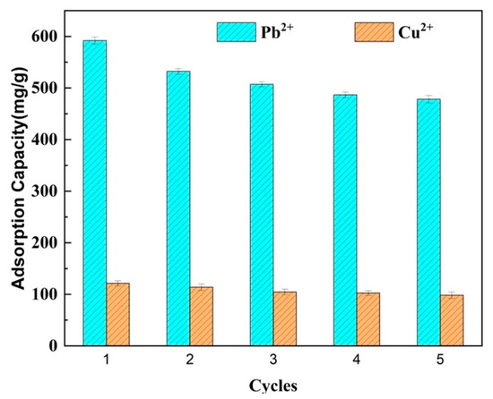 The evaluation of regeneration is a crucial aspect when assessing the performance of adsorbents. In this study, the regeneration of LR-EPI-8 for Pb2+ and Cu2+ ions was examined through a series of five adsorption–desorption cycles. The initial adsorption capacity observed in the first cycle was considered to be 100%. Subsequently, the ratio of the adsorption capacity in each cycle to that of the initial cycle was calculated to assess the regeneration of the hydrogel. As depicted in Figure 10, the adsorption capacities exhibited a gradual decrease over successive cycles. However, even after undergoing five cycles of adsorption, the adsorption capacities for both Pb2+ and Cu2+ ions remained above 75%. This observation indicates that the magnetic hydrogels not only facilitated easy recovery, but also demonstrated excellent regeneration.