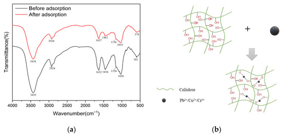 A thorough understanding of the adsorption mechanism of LR-EPI hydrogels for heavy metal ions is crucial for evaluating their adsorption performance. Generally, various interactions such as ion exchange, hydrophobic interactions, coordination interactions, and electrostatic interactions can occur during the adsorption process of LR-EPI hydrogels. In this case, the primary adsorption mechanism for LR-EPI hydrogels is believed to be the electrostatic interaction with heavy metal ions. This interaction occurs between specific functional groups in the monomer units of the adsorbents, resulting in the absorption or desorption of heavy metals through cation–anionic interactions [70]. By analyzing the FTIR spectra of LR-EPI-8 before and after the adsorption (Figure 11a), changes in the peak positions can be observed. The peaks at 1454 and 1026 cm−1, corresponding to O-H bending and symmetrical/asymmetrical C-O-C stretching vibrations, underwent alterations after adsorption. Additionally, the peak at 1632 cm−1, attributed to C=O from ester groups in cellulose, also experienced changes. From the change of peaks before and after adsorption, it is known that the major adsorption sites are -OH groups. Furthermore, as depicted in Figure S3, the LR-EPI-8 hydrogel exhibited a negative charge within the pH range of 2.0–5.0. With an increase in pH, the surface functional groups, such as -OH groups, lose protons due to the higher concentrations of OH− ions, leading to the formation of anions like -O- on the surface of the adsorbent. This electrostatically charged surface facilitates the adsorption of positively charged Pb2+, Cu2+, and Cr3+ ions onto the negatively charged hydrogel. According to XPS before and after the adsorption for Cr3+, and by considering the spectra of C1s and O1s, we hypothesized that both carbon (C) and oxygen (O) elements were involved in the adsorption process with strong interactions between the -OH groups and Cr3+. Consequently, the adsorption processes were driven by an ion-exchange reaction coupled with the coordination of -OH with metal ions, while other forces such as electrostatic and hydrogen bonding also played roles. The possible adsorption mechanism is illustrated in Figure 11b.