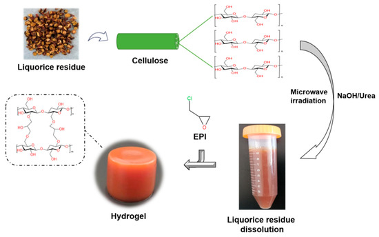 However, due to the abundance of hydroxyl groups, the utilization of natural cellulose in the preparation of hydrogels based on Chinese herb residue requires chemical modification [40,41]. Chemical crosslinking enables cellulose to form a hydrogel with enhanced adsorption capacity and mechanical stability [42]. Commonly used crosslinking agents include citric acid, epichlorohydrin, and glutaraldehyde [43,44]. In a previous study, the crosslinking of cellulose using epichlorohydrin (EPI) had shown improvements in adsorption capacity, chemical stability, pore size distribution, and mechanical properties [45]. In comparison, glutaraldehyde raised concerns regarding the potential presence of toxic residues after the reaction [46]. Moreover, the use of citric acid or cellulose crosslinking required an elevated temperature to achieve higher crosslinking efficiency, which may lead to cellulose degradation [47]. Based on the aforementioned factors, EPI is considered a superior crosslinker for hydrogel preparation.