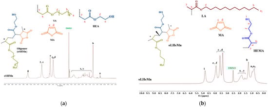 Conductometric and Brown–Fujimori titrations were performed for the assessment of MA integration and intactness in both groups of ter-oligomers [,]. Contrary to the other comonomers (SA, LA, HEA, and HEMA), incorporation of MA in the ter-oligomers could not be quantified using 1H-NMR owing to overlapping signals, as shown in Figure 1a,b. Figure 2 exhibits the relationship between the theoretical incorporation of MA units (measured by comonomer feed), total percentage of MA content in the ter-oligomer (measured by conductometric titration), and intact anhydride moiety contents (measured by Brown–Fujimori titration).