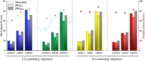 The reactivity of the oligomers was investigated by conductometric titrations (MA integration) and Brown–Fujimori titrations (MA intactness) [,]. Figure 2 illustrates the relationship between the MA content in the theoretical feed, the MA incorporated in the oligomer, and total intact anhydride moieties for the LA- and SA-containing ter-oligomers. Overall, MA incorporation in all ter-oligomers was dependent upon the theoretical MA feed. A strictly increasing but non-linear relationship was found between the MA theoretical feed and oligomer MA incorporation. With low MA feed (MA = 2.5), values for [MA]CT and the theoretical feed were very close to each other. The values were higher at higher MA feed (MA = 5 or 10) for LA-containing ter-oligomers. However, SA-containing oligomers exhibited good control over MA incorporation ([MA]CT) in relation to the MA theoretical feed. In all cases, [MA]BFT illustrated higher values, which could be due to a fraction of the MA content being hydrolyzed during synthesis, storage, or analysis. In addition, 60–90% of the anhydride units were calculated to be preserved for all ter-oligomers, an indication of good reactivity of the oligomers for further crosslinking reactions [,].