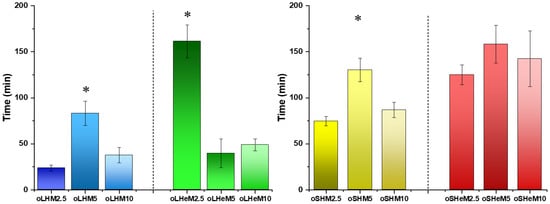 Dissolution studies on two sets of hydrophilic oligomers (oSXMs and oLXMs) for different MA feeds. The bars indicate the time at which 60% of maximum light transmittance was achieved as a measure of initial dissolution kinetics. Asterisks (*) indicate significant differences with other members of the same group. All experiments have been performed in triplicate.
