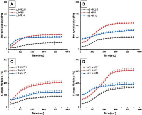 Rheological characterization of crosslinking reactions between gelatin and different oligomers. Time sweep profiles of storage modulus values (G′) for different oligomers: (A) oLHM, (B) oSHM, (C) oLHeM, and (D) oSHeM. Means and standard deviations (n = 3) have been represented by data points and error bars.