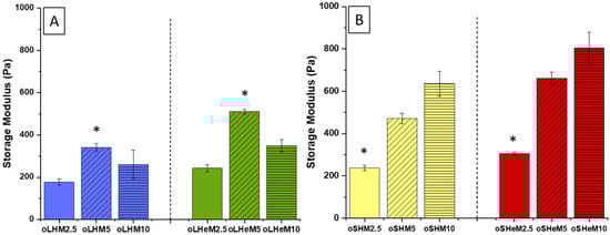 Storage modulus values for pre-fabricated hydrogels from oLXM (A) and oSXM (B) oligomers with different hydrophobic domains and MA contents. Average and standard deviation values (n = 5) are represented by columns and error bars. Asterisks (*) indicate statistically significant differences (p < 0.05).