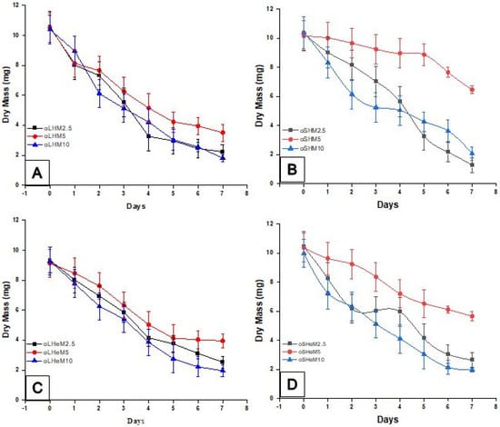 Figure 6 elucidates the dry weights of the oligomer-crosslinked hydrogels for all compositions. The dry weights were determined gravimetrically. Determination of dry masses over a period of 2 weeks indicated that the crosslinker composition was the most important for holding the gelatin molecules together. Generally, the crosslinked hydrogels for all groups exhibited smooth degradation profiles in the stipulated time. The minor rise in the dry weights at early time points could be attributed to the deposition of salts and residual water in the hydrogels. Overall, the MA-5-containing oligomers were the most stable hydrogels in all groups. This could be related to the uniform and complete crosslinking in these oligomer-based hydrogels. On the other hand, insufficient crosslinking in the MA-2.5-containing crosslinked hydrogels and inconsistent crosslinking in the MA-7.5-containing crosslinked hydrogels led to the formation of loose and inhomogeneous matrices that showed faster degradation rates in the stipulated time. Comparing the oligomers, the oLHM crosslinked hydrogels showed the fastest degradation rates in PBS and less than 30% intact mass remained after 2 weeks. In comparison, the oLHeM and oSHM crosslinked hydrogels exhibited more than 30% dry mass after a similar duration. However, the oSHeM crosslinked hydrogels showed delayed degradation and only 50% mass was lost in 2 weeks. The resilience to degradation for the oSHeM crosslinked hydrogels could be linked to the high storage modulus values of these matrices (Figure 6). Oligomer composition, homogeneity, and maximum crosslinking resulted in delayed degradation for these matrices. Insignificant variations in pH values were observed in the degrading solutions. Quick degradation was observed after 2 weeks and no substantial residues were observed. In comparison to this in vitro degradation profile, enzymatic activity can lead to faster degradation for gelatin-based matrices in vivo [].