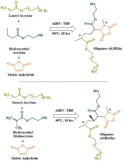 Two novel sets of oligomers, i.e., oligo LA-co-HEA-co-MA (oLHM) and oligo LA-co-HEMA-co-MA (oLHeM), and oligo SA-co-HEA-co-MA (oSHM) and oligo SA-co-HEMA-co-MA (oSHeM), were synthesized using different combinations of hydrophobic domain-containing lauryl acrylate (LA) and stearyl acrylate (SA) with hydroxyethyl acrylate (HEA), hydroxyethyl methacrylate (HEMA), and reactive monomer (maleic anhydride–MA) under an inert N2 atmosphere at 60 °C for 18 h []. Free radical polymerization of the hydrophilic comonomers (HEA or HEMA) was initiated with the addition of 3% (N/N) AIBN dissolved in THF (Scheme 1). The ratio of comonomer (LA or SA): sum of HEA/HEMA and MA monomers was maintained as 1:20. The synthesized oligomers were purified using n-hexane three times and stored under reduced pressure.