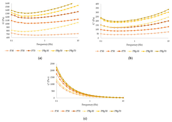 (a) G′, storage modulus; (b) G″, loss modulus; (c) η*, complex viscosity of the gels (with and without orange by-product) after 3D printing. (P, printed sample; PBp: printed sample with by-product; 30, 50 and 70% apricot pulp, respectively).