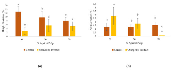 (a) Deviations of the height parameter of the printed samples; (b) deviations of the area parameter of the printed sample with respect % apricot pulp (30, 50 and 70%). Letters (a–e) indicate homogeneous groups according to ANOVA (p < 0.05). (Control: P30, P50 and P70; orange by-product: PBP30, PBP50 and PBP70.)