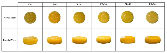 Images of the 3D printed (P) samples from aerial view and frontal view. (Control: P30, P50 and P70; orange by-product: PBP30, PBP50 and PBP70.)