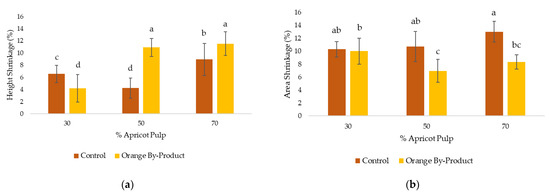(a) Shrinkage of the height parameter of the freeze-dried (FD) samples; (b) shrinkage of the area parameter of the freeze-dried (FD) samples with respect % apricot pulp (30, 50 and 70%). Letters (a–d) indicate homogeneous groups according to ANOVA (p < 0.05). (Control: FD30, FD50 and FD70; orange by-product: FDBP30, FDBP50 and FDBP70.)