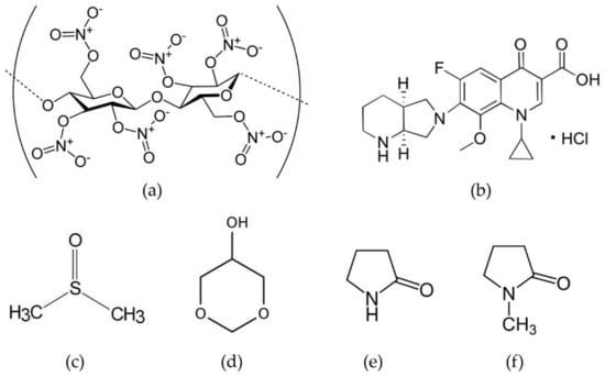 Chemical structures of nitrocellulose (Nc) (a), moxifloxacin HCL (Mx) (b), dimethyl sulfoxide (DMSO) (c), glycerol formal (Gf) (d), 2-pyrrolidinone (Py) (e), and N-methyl-2-pyrrolidone (N) (f).