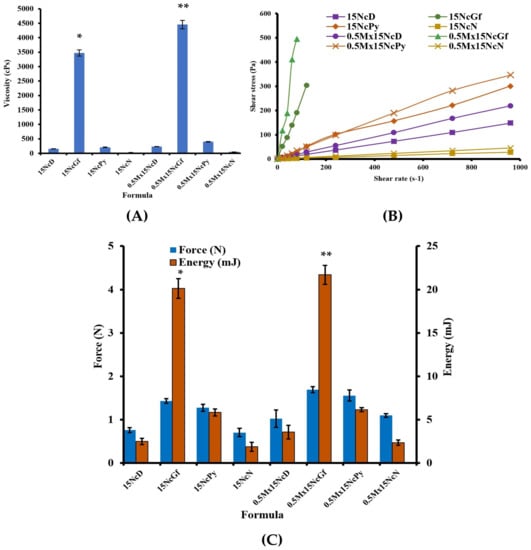 Viscosity (A); relationship between shear stress and shear rates (B); injection force and energy from injectability test (C) of drug free and Mx-incorporated Nc-based ISGs. * and ** represent a significant difference (p < 0.01) within the tested formulations.