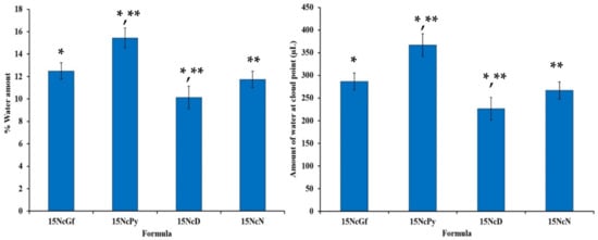 % Water amount and amount of water at cloud point of drug-free and Mx-incorporated Nc-based solutions after titration with deionized water at temperature of 25 °C (n = 3). * and ** represent a significant difference (p < 0.05) within the tested formulations.