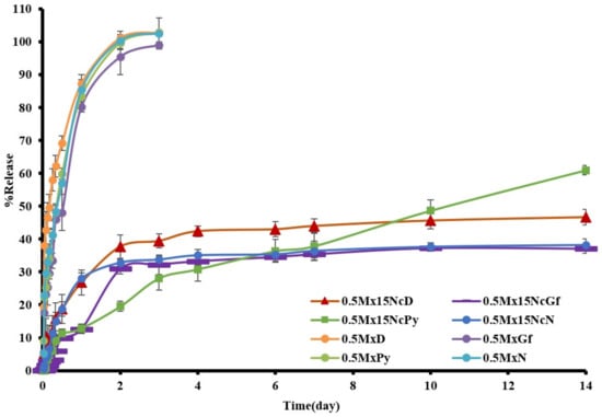 The drug content in samples of Mx dissolved in different solvents, including 0.5MxN, 0.5MxPy, 0.5MxGf, and 0.5MxD, was found to be 98.27 ± 1.01%, 97.61 ± 0.33%, 99.05 ± 1.06%, and 100.71 ± 0.83%, respectively. Meanwhile, the drug content in drug-incorporated ISGs, including 0.5Mx15NcN, 0.5Mx15NcPy, 0.5Mx15NcGf, and 0.5Mx15NcD, was 96.46 ± 0.86%, 98.11 ± 0.82%, 97.43 ± 1.27%, and 96.45 ± 0.52%, respectively. The release of Mx from the solutions without Nc addition was rapid, reaching a plateau state within 3 h (Figure 6). In contrast, a slower drug release was observed for all Mx-loaded Nc-based ISGs, and the burst drug release was reduced by incorporating Nc into the ISGs. The drug-incorporated Nc-based ISGs exhibited gradual release of Mx in the initial phase of the release profiles. Notably, 0.5Mx15NcPy showed a steeper release at a later stage, indicating a more pronounced and freely releasing behavior compared to other ISGs. This behavior can be attributed to the increased pore formation observed in the SEM analysis for 0.5Mx15NcPy. The 15% bleached-shellac-based ISG demonstrated sustained drug release of approximately 70% over 54 h, where the polymer concentration plays a crucial role in controlling the drug release mechanism []. The addition of a water-soluble additive has been investigated to modulate the drug release profile. For example, the addition of PEG 1500 reduced burst release and enhanced sustained release in a Eudragit® RS ISG []. The inclusion of freely water-soluble compounds can facilitate drug release by creating high porosity, leading to increased erosion and subsequent drug release. Commercial products such as Atridox® containing doxycycline hyclate using poly(D,L-lactide) as a polymeric material controlled the drug release for 1–2 weeks [].