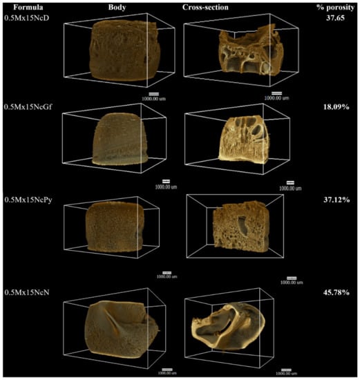 The remnant porosity of 0.5Mx15NcN was found to be greater than that of 0.5Mx15NcD, 0.5Mx15NcPy, and 0.5Mx15NcGf, as shown in Figure 8. This difference in porosity could be attributed to structural changes that occurred during the freeze-drying process. The presence of macrovoids or finger-like structures within the remnants was observed, resembling the structure of an asymmetric membrane with a thin top skin layer supported by a finger-like sublayer. The formation of finger-like structures typically involves two processes: pore initiation and growth []. During the liquid–liquid phase separation of the Nc-based solution, the development of Nc-rich and Nc-lean phases leads to the initiation of nuclei for the finger-like structures. These nuclei are mainly formed beneath the top layer, and their growth depends on the state of the solution at the interface of the phase separation []. The self-formation of scaffold structures is a characteristic feature of injectable in situ forming bioactive-compound-delivery systems. Therefore, X-ray tomographic imaging serves as a valuable technique for scrutinizing and tracking the three-dimensional geometries and porosity characteristics of these systems. It provides important insights into the internal structure and porosity of the remnants, aiding in the understanding and characterization of the Nc-based ISGs.