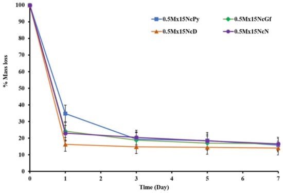 This study aimed to investigate the in vitro degradation behavior of the Mx-incorporated Nc-based ISGs by determining the mass loss. The percentage of in vitro degradation for the ISGs over one week is shown in Figure 9, and the values for %wex and %wobt are calculated and presented in Table 2. The mass loss of the ISGs was assessed after incubation in a release medium at a specific pH, which is a common method for evaluating in vitro degradation []. An abrupt mass loss was observed for all ISGs on the first day, indicating the diffusion of both Mx and the solvent into the release medium through solvent exchange. As the release of the solvent and drug reached a steady state, the total mass loss of the ISGs gradually increased and eventually reached a plateau. Water uptake played a critical role in promoting this behavior. Among the ISGs, 0.5Mx15NcPy showed slightly lower % degradation compared to the other ISGs, which correlated with its lower drug release during the initial phase.