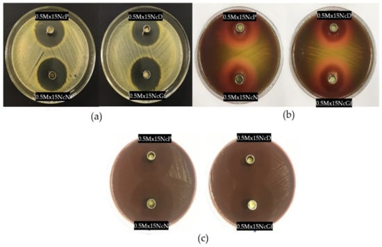 Photographs of inhibition zone of 0.5Mx15NcP (upper-left cup), 0.5Mx15NcD (upper-right cup), 0.5Mx15NcN (lower-left cup), and 0.5Mx15NcGf (lower-right cup) ISG formulations against S. aureus 43300 (MRSA) (a), P. gingivalis (b), and A. actinomycetemcomitans (c) (n = 3).