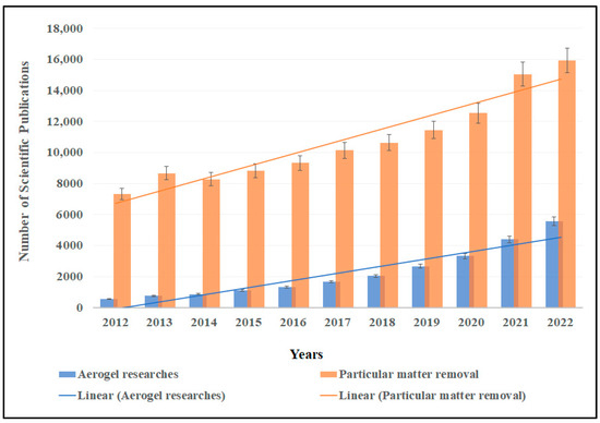 Air filters have been used to capture different types of PM, including PM10 and PM2.5 [8,9]. The PM filter industry has had tremendous progression, even though some concerns and challenges still exist. First of all, the technology that has been used for existing PM filters is lacking ecofriendly characteristics since remarkable amounts of solvents and toxic materials are used for the electrospinning process that negatively influence human health and the surrounding environment [10]. Moreover, the accumulating discarded filters with high volumes of trapped PM constitute a direct threat to the environment. Besides the toxicity, those PM filters were designed to capture PM at a small range of concentration which is 1000 mg within the size of a cubic centimeter. In this case, those filters are facing a great challenge to capture PM within highly polluted environments. The capture of particulate matter via conventional and common purification technologies basically focuses on size-dependent mechanisms, which in most cases is fairly difficult due to the extremely small particle size of particulate matter and its ultra-low mass [11]. Conventional filters have been made of several materials such as fabrics, wool, cotton, etc., mostly without considering their pore size or removal efficiency. In the research of Liu et al. [12], filters made of a polyamide-56 nanofiber/net had a high filtration effectiveness of 99.995% for most of air pollutants. Although the filter was able to remove almost all the particulate matter, the issue of using toxic and non-ecofriendly material is still present. Other scientists have used PLA/PMMA composite nanofibers to solve the fine particle matter issue and claim that they removed 99.5% of PM2.5 using synthetic stimulations [13]. Liu et al. [14] developed a superhydrophobic filter using a mix of synthetic polymers and they were able to remove up to 96% of the PM2.5. Bioaerogels have been proposed for PM filtration as ecofriendly and sustainable functional materials [15]. Bioaerogels are known to have various advantages over synthetic-based materials such as regeneration, biocompatibility, biodegradability, low density, high porosity, and a large specific surface area [16,17]. They are three-dimensional nanoporous structures with high surface area and porosity, derived from biopolymers such as chitosan, cellulose, alginate, or proteins [18,19]. These aerogels exhibit unique properties that make them attractive for various applications across multiple industries. Thus, extensive studies have been conducted regarding the fabrication, modification, and application of aerogels in the past few years, which can be observed from the increased number of scientific publications in the past ten years together with concerns about the adverse health effects of particulate matter pollution (Figure 1).