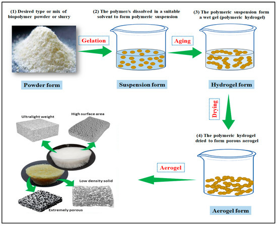 In recent years, there have been notable developments in the formation of various forms of aerogels, such as biomass-derived, inorganic carbon-based, polymer-based, and silica-based aerogels, among others [25]. Aerogels can be made from a wide range of materials, and the properties of the aerogel depend on the material used [28]. However, the absence of unique characteristics in a single material restricts the versatility of many pure aerogels. As a result, composite aerogels offer a solution for numerous potential applications by allowing for the enhancement, introduction, and development of new materials for a variety of new uses. The past few years witnessed the development of several techniques for the fabrication of biopolymer-based nanostructured bioaerogels. But all of these techniques follow the same basic principle: the gelation of polymeric suspension, aging, and finally drying (Figure 2) [29].