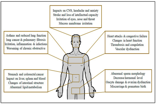 Particulate matter can pose a serious threat to human health, particularly if the particles are small enough to penetrate deep into the lungs and enter the bloodstream [99]. Exposure to high levels of particulate matter has been linked to a range of health problems, including respiratory and cardiovascular diseases, lung cancer, and premature death [100,101]. PM pollutants have been recently considered as a serious threat to public health due to their adverse health effects [102]. The inhalation of particulate matter can lead to respiratory diseases such as coughing, breathing difficulties, chronic bronchitis, and even cancer. The level of danger posed by these particles is inversely related to their size. Particles ranging from 5.5 to 9.2 μm in diameter can cause breathing difficulties by lodging in the nose and throat, while particles smaller than 5.5 μm can penetrate the breathing passages and cause more severe illnesses. The most perilous particles are those with a diameter of less than 1 μm, which can remain in air sacs and significantly increase the risk of lung cancer. PM has been reported to form a real danger to the human health since it has the ability to penetrate the human body through the respiratory system [103]. Exposure to fine particles can cause short-term health effects such as eye, nose, throat and lung irritation, coughing, sneezing, runny nose, and shortness of breath [2,104,105]. It was found that particulate matter particles are able to inhibit the biophysical functions of the lung surfactants by impeding molecular packaging in addition to the formation of surfactant–particle aggregates [106]. Fine particulate matter also can hinder and even prevent particle–cell interactions, which could modify the toxicological impact of the inhaled particles [107,108]. Thangavel et al. [5] extensively discussed the toxicity and adverse health effects of different types and sources of particulate matter. Figure 4 illustrates the adverse impacts of particulate matter on different parts of the human body.