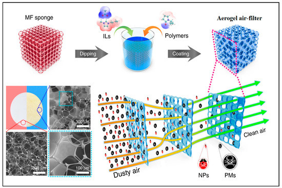 Illustration of multilayered aerogel-based air filtration approach. Melamine–formaldehyde (MF), ionic liquids (ILs), nanoscale particles (NPs), and particulate matter (PM). Adapted with permission from [102].