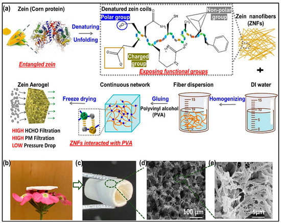 Preparation of corn protein nanostructured aerogels; (a) schematic drawing of the whole preparation process; (b) a diagram of the aerogel being placed on a flower to show the light weight; (c–e) the morphology and SEM images of the fabricated nanostructured aerogel. Adapted with permission from Lin et al. [116].