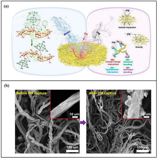Hydrophobic nanocellulose aerogel for particulate matter removal; (a) Schematic drawing of the aerogel mechanism and (b) SEM images before and after PM capturing. Adapted from with permission Lyu et al. [119].