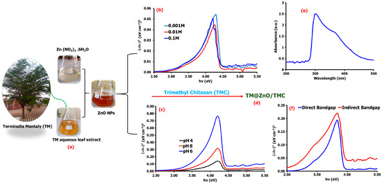 Schematic representation of the synthesis of ZnO NPs from TM leaf extract (a), the direct and indirect bandgap energies of the synthesized TM@ZnO NPs at varying concentrations of the precursor salts (b) and pH (c). The produced TM@ZnO/TMC NC hydrogel product (d), its UV–vis spectrum (e), and the corresponding bandgap spectra (f).