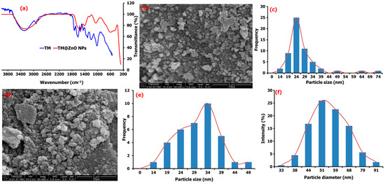 The morphology of as-synthesized ZnO-biomediated TM shown in the field emission scanning electron microscopy (FESEM) images (Figure 2b) are quasi-spherical in shape with particle size distribution ranging from 14 to 25 nm, with a mean value of 25.5 ± 3.2 nm (Figure 2c). The formation of the quasi-spherical-shaped structures of ZnO-NPs is due to Zn2+ interaction with the OH− ions in the plant extract and subsequent heat treatment that slowly converts the zincate ions into ZnO. The ZnO crystal structure is slowly formed by the surrounding OH− ions, behaving as a polar crystal and on the saturation, allowing the ZnO nucleus to grow, and initiates particle formations [26]. The FESEM of TM@ZnO NPs-coated TMC displayed in Figure 2d showed a relatively higher agglomeration but random spherical morphology compared to the uncoated TM@ZnO NPs. The particle size due to the polymer composite formation produced an overlapping particle size in the range of 14–49 nm with a mean value of 31.81 ± 2.68 nm (Figure 1e). The increase in grain size from the overlaying of particles influenced the nucleation processes and relatively maintained the nanometric shapes formation processes [19,26]. The hydrodynamic size of TM@ZnO/TMC NC (Figure 1f) determined using dynamic light scattering (DLS) shows the particle diameter with an average size of 57.75 ± 19.18 nm for the aqueous preparation, which is a bit larger compared to the size distribution obtained from FESEM (Figure 1e). The increase was largely due to the deposition of hydrate layers on ZnO-NPs polymer surface [32].