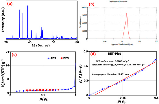 (a) The XRD pattern, (b) the zeta potential from DLS analysis, (c) the adsorption/desorption isotherms, and (d) BET analysis of TM@ZnO/TMC NC hydrogel.