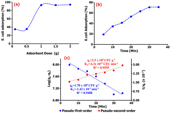 The adsorption study displayed in Figure 4a demonstrated to have a dose-dependent E. coli adsorption of ~70% onto TM@ZnO/TMC NC hydrogel in the aqueous suspension within a short interaction time of 5–35 min (Figure 4b). The sorption sites created by the addition of amine and carboxylate functional groups from the surface coating with TMC allowed for a systemic or gradual adsorption behavior, as shown in the figure. The presence of quaternary ammonium compounds on the surface of NPs were reported to aid the microfiltration of E. coli and observed to demonstrate 90% removal efficiency [51]. The adsorption kinetics established over the prescribed time was utilized in this work to investigate the sorption mechanism of E. coli onto TM@ZnO/TMC NC hydrogel. From the short interaction time, the kinetic study, as shown in Figure 4c, was observed to best follow the pseudo-second-order mechanism with rate constant and removal rate of 2.5 × 108 CFU g−1 and 6.3 × 1023 CFU min−1, respectively. This demonstrated the highest level of linearity (0.9555) in comparison with the determination by the first-order adsorption model (0.9488), thereby predicting chemisorption as the rate-limiting step describing the adsorption processes [52], thus serving as the best kinetic model to describe the adsorption of E. coli onto TM@ZnO/TMC NC hydrogel, supporting the claim of pseudo-second order, describing the equilibrium of E. coli adsorption onto the surface of NC hydrogel [2,53].