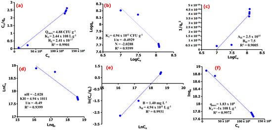 (a) Langmuir, (b) Freundlich, (c) Harkin–Jura, (d) Halsey, (e) Redlich–Peterson, (f) Jovanovic adsorption isotherm models of E. coli adsorption onto TM@ZnO/TMC NC hydrogel.