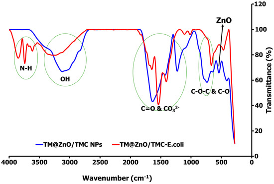 The spectral profiles of TM@ZnO/TMC NC hydrogel on interaction with E. coli underwent some conformational changes in the broad peaks assigned to the stretching vibrations of the amines and –OH (3000–3129 cm −1). In addition to the broad band of –OH peak centered at 3338 cm−1, the TM@ZnO/TMC NC hydrogel on interaction with E. coli produced additional peaks at 3619–3856 cm−1. These regions in the untreated bacterial profile are utilized as specific fingerprints in the identification of fecal E. coli activities using FTIR [68,69]. The peaks are associated with the stretching activities of N–H of amides in the protein structure of E. coli. The surface interactions of E. coli with NPs were reported to introduce spectral changes in the N-H, C-H, and the C-O-C and C-O stretching activities of the E. coli [68,69], further reported to introduce a spectral shift in the amide-protein region in bacteria-treated AgNPs [68] and E. coli exposed to quantum dot NPs [70]. In the spectra of TM@ZnO/TMC NC hydrogel displayed in Figure 6 is the peak at 1647 cm−1 following the interaction with E. coli increase by 6 cm−1 in wavelength to 1653 cm−1 in the spectra of TM@ZnO/TMC-E. coli. The vibrational activities in such a region were reported to be governed by the stretching effects of C=O of proteins sheet structures [68]. This is supported in another study to show C=O bonds at 1690 cm−1 in NPs-treated pathogenic bacteria [71]. Additional peaks at 1543–1416 cm−1 corresponding to CO32− stretching vibrations were also detected in the spectra of TM@ZnO/TMC-E. coli. Exposure of E. coli to NPs was reported to induce spectral changes from 1440 to 1460 cm−1 [68,72,73]. The peak at 1234 cm−1 in the spectra of TM@ZnO/TMC NC hydrogel was observed to split as 1000–1105 cm−1 in the spectra of TM@ZnO/TMC-E. coli. The bands at 1055 and 1058 cm−1 observed in the spectra of E. coli not exposed to NPs were reported to undergo a shift in wavelengths on exposure to Cu/Zn NPs, which identified the interactions to occur at the C-C bond of the carbohydrate region of the bacteria [68,74,75].