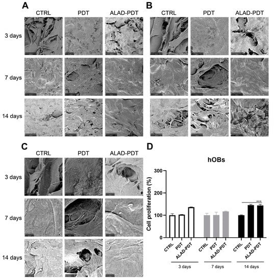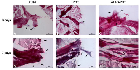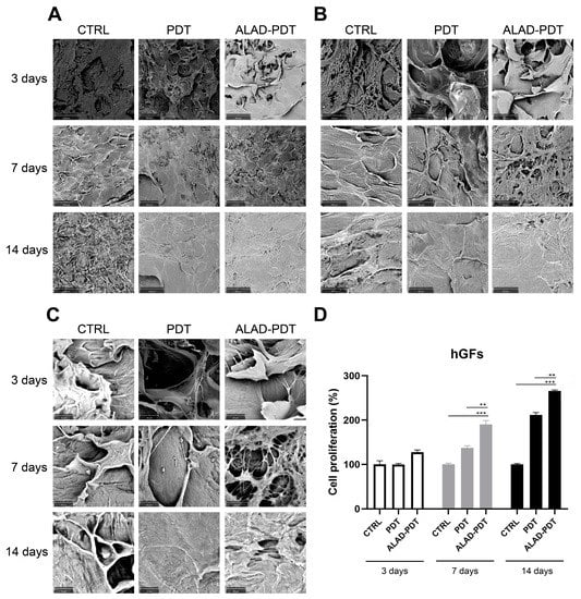 - ALAD-PDT: cells cultured on the membrane and treated with a gel containing 5% of 5-aminolevulinic acid (ALAD) for 45 min and irradiated with red light (LED) for 7 min;