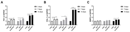 - Karrer, S.; Bosserhoff, A.K.; Weiderer, P.; Landthaler, M.; Szeimies, R.M. Influence of 5-Aminolevulinic Acid and Red Light on Collagen Metabolism of Human Dermal Fibroblasts. J. Investig. Dermatol. 2003, 120, 325–331. [Google Scholar] [CrossRef] [PubMed]