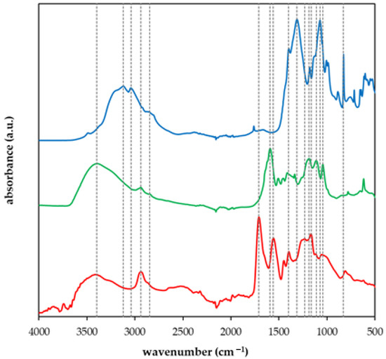 Figure 1. FT-IR spectra of NPK (blue), lignohumate (green), and sample A (red). Dotted lines are added for easy comparison of peaks in spectra.