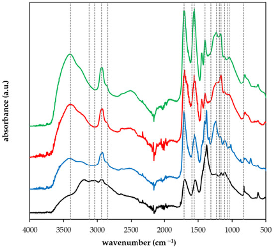 Figure 2. FT-IR spectra of samples C (blue), D (black), G (red), and H (green). Dotted lines are added for easy comparison of peaks in spectra.
