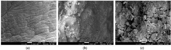 Figure 3. SEM photos of samples A with low content of NPK (a), B with high content of NPK (b), and D with high content of NPK and LH (c) before swelling.