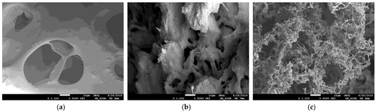 Figure 6. SEM photos of samples C with low content of NPK and LH in detail (a), G with AM and LH (b), and H with LH (c) after swelling and freeze-drying.