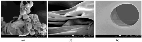 The surface morphology of superabsorbent polymers in lower magnification was not affected by the addition of NPK, LH, and AM (Figure 4). Prepared samples (before swelling) had similar characteristics. The surface heterogeneity caused by the increased amount of NPK incorporated into polymers was, in the lower magnitude, less visible (not shown). The addition of LH resulted in the brown coloration of the prepared samples. Although some authors (e.g., [53]) observed the increase in hydrogel porosity in the case of higher content of AM, the low AM amount added in polymers had no similar effect. In Figure 5, the comparison of swollen and freeze-dried hydrogels is shown. It was observed that the NPK addition resulted in a decrease in pore size. While the sizes of pores and voids in the hydrogel with low content of NPK were several tens of μm (Figure 5a), it decreased in magnitude if the addition of NPK was higher (Figure 5b). The surface of pores was covered by NPK fertilizer, similarly as in refs. [45,51]. The incorporation of LH in the superabsorbent polymer changed the structure of the swollen hydrogel. We can see that it is much miscellaneous and rich in different pores and voids of a wide range of their sizes. The detail of the structure formed by the combination of NPK and LH is shown in Figure 6a. This structure was detected only in the case of sample C; the higher content of NPK resulted in the collapse of this miscellaneous character, and the crystals originating from NPK covered the pore surface. Although the addition of AM was not too high in comparison with other studies [2,3,5,10,49,54,55,56], its presence in hydrogel significantly changed the shape of pores and voids from spherical to oblong slits. This observation can influence the swelling behavior of samples enriched with AM, as described in Section 2.3.