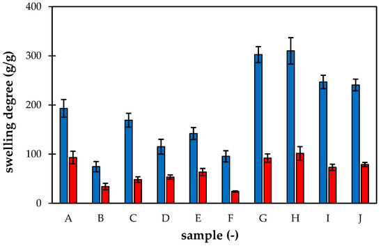 Figure 7. Swelling degree of prepared superabsorbent polymers in deionized (blue) and tap (red) water. Samples A and B contain only NPK, C, D, E, and F combination of NPK and LH, G and H only LH. Samples I and J are without nutrients. AM was added to samples E, F, G, and J.